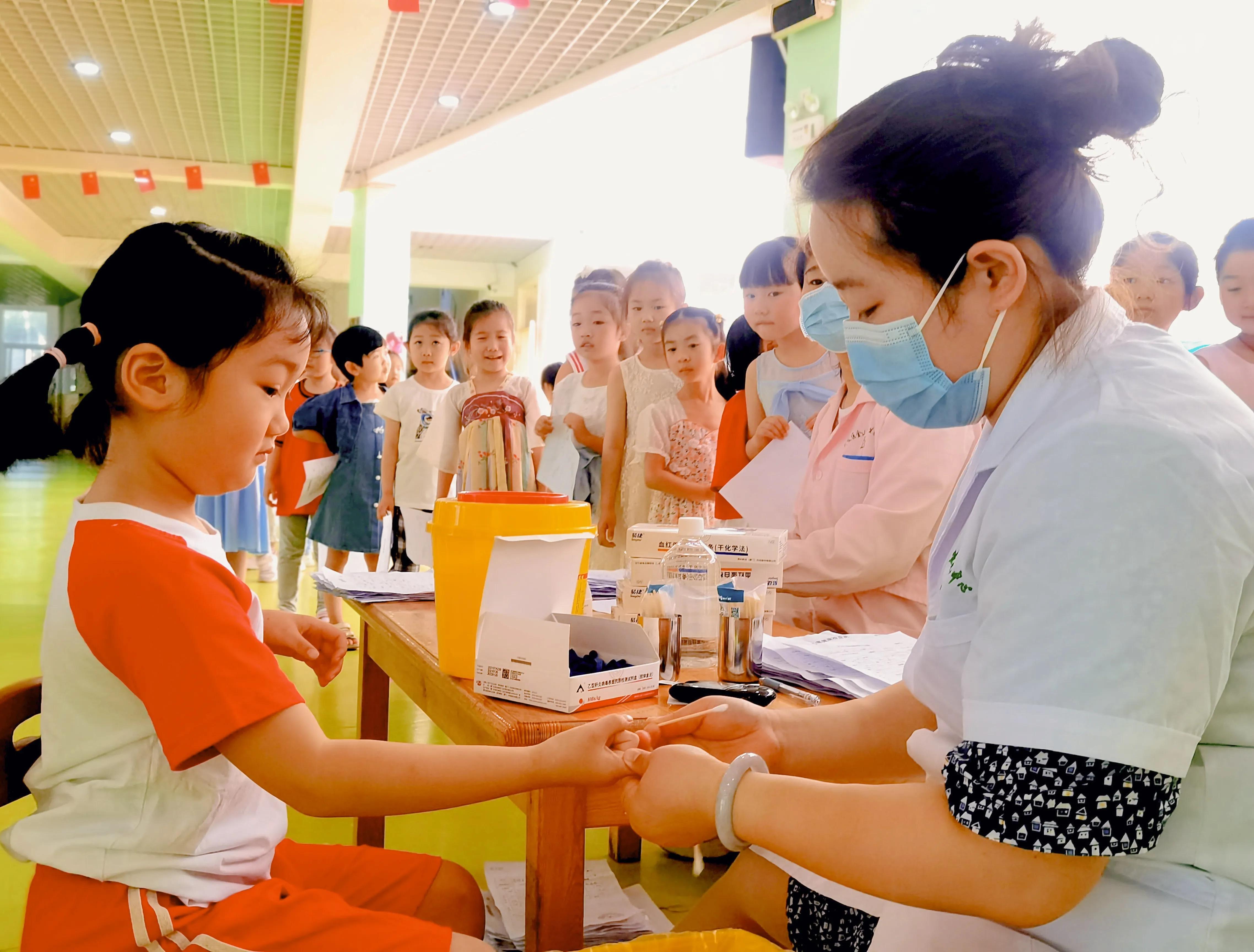 為促進(jìn)幼兒的身體健康,了解幼兒的生長發(fā)育狀況,日前,駐馬店市實(shí)驗(yàn)幼兒園聯(lián)合社區(qū)醫(yī)院的醫(yī)務(wù)人員,為全體幼兒進(jìn)行期終健康體檢。此次體檢的項(xiàng)目有身高體重測量、心肺聽診、牙齒檢查、視力檢查等。
