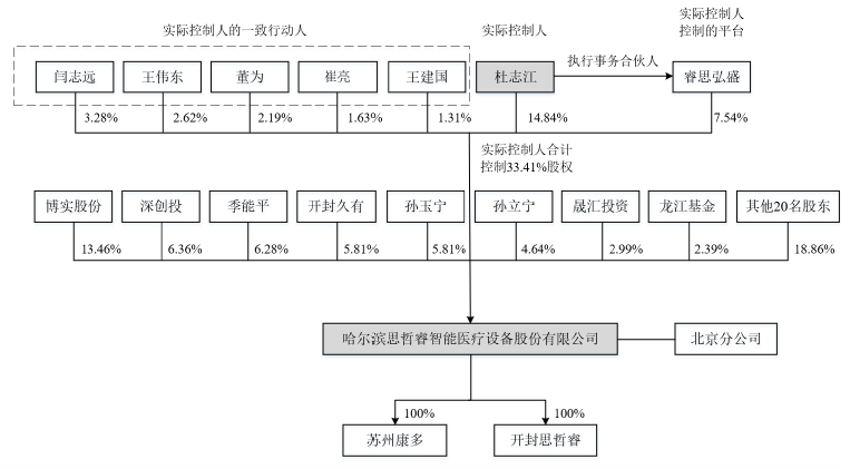 不過,隨著外部投資者涌入,思哲睿股權較為分散。IPO前,思哲睿無控股股東,實際控制人為杜志江。杜志江通過直接持有14.84%股份、一致行動人持有11.03%股份、作為合伙人參股公司睿思弘盛持有7.54%股份,合計控制思哲睿33.41%股份。