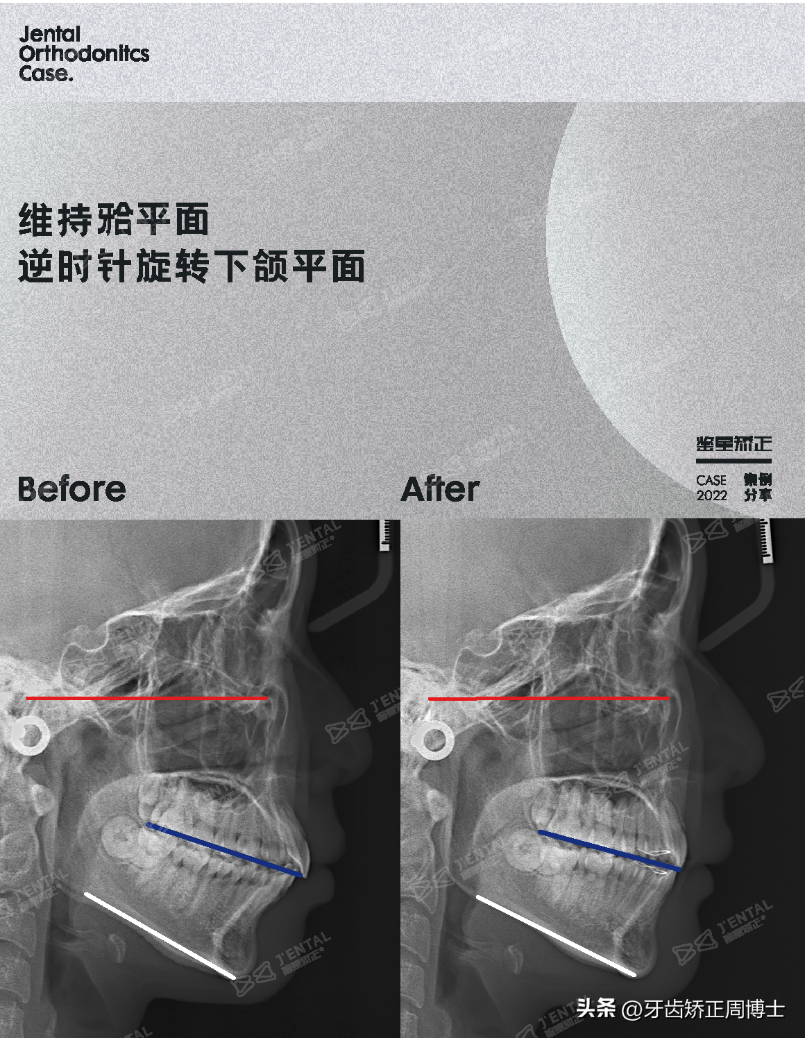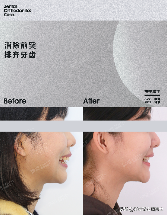 正確的思路實(shí)際上是矯正牙齒,這樣骨性前突和下頜后縮可以一同得到改良。這也是我們典型的案例之一,想要解決前突后縮,就需要讓下巴逆旋,這樣前突解決的同時下巴也“旋”出來了,從側(cè)面看就是漂亮的直面型。