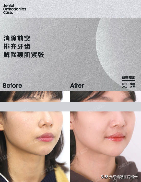 從后的對比圖可以看到她的面下三分之一的變化很大,口周肌肉得到放松之后,視覺看上去嘴唇變小了。突嘴內(nèi)收進(jìn)去后,原先偏銳的鼻唇角變?yōu)閹缀踔苯?,頦部也從后縮的狀態(tài)變化到擁有的頦唇溝,面型得到的改良。