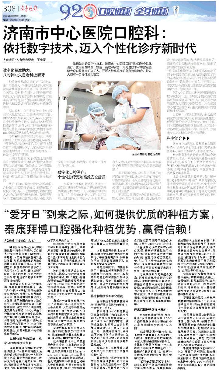 在數(shù)字化技術(shù)的支持下,濟(jì)南市中心醫(yī)院口腔科成功開展了多項(xiàng)新的復(fù)雜種植技術(shù)?!叭缛跓o(wú)牙頜患者的復(fù)種,上午將種植體種進(jìn)去,下午就可以戴上臨時(shí)的假牙,等五六個(gè)月后再戴上義齒,實(shí)現(xiàn)牙齒的無(wú)縫銜接,大大減少了患者等待期間帶臨時(shí)義齒的不舒適感。”