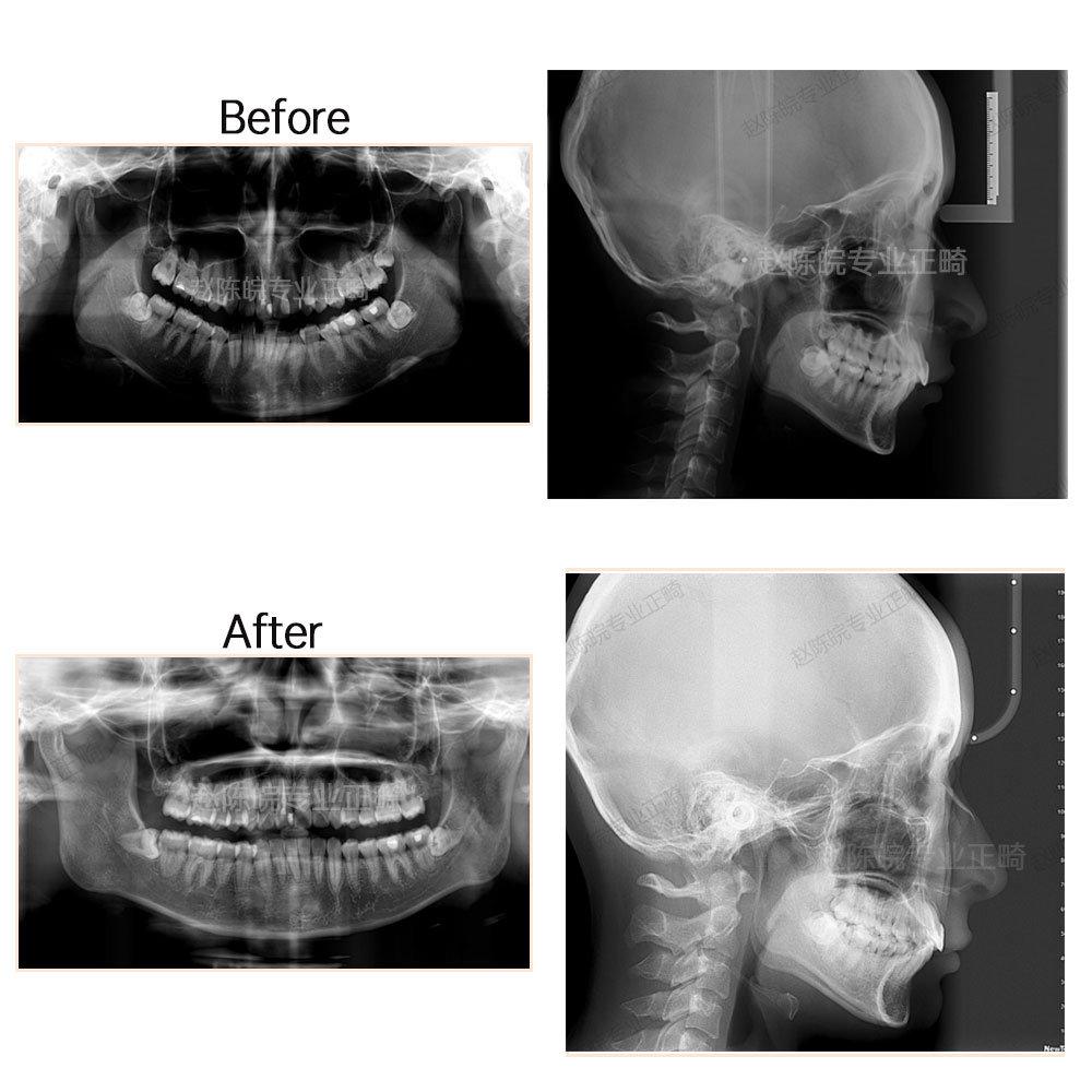 ?矯正前后X線片前后對比圖(觀察對比側(cè)面顱骨情況及牙體牙周情況)