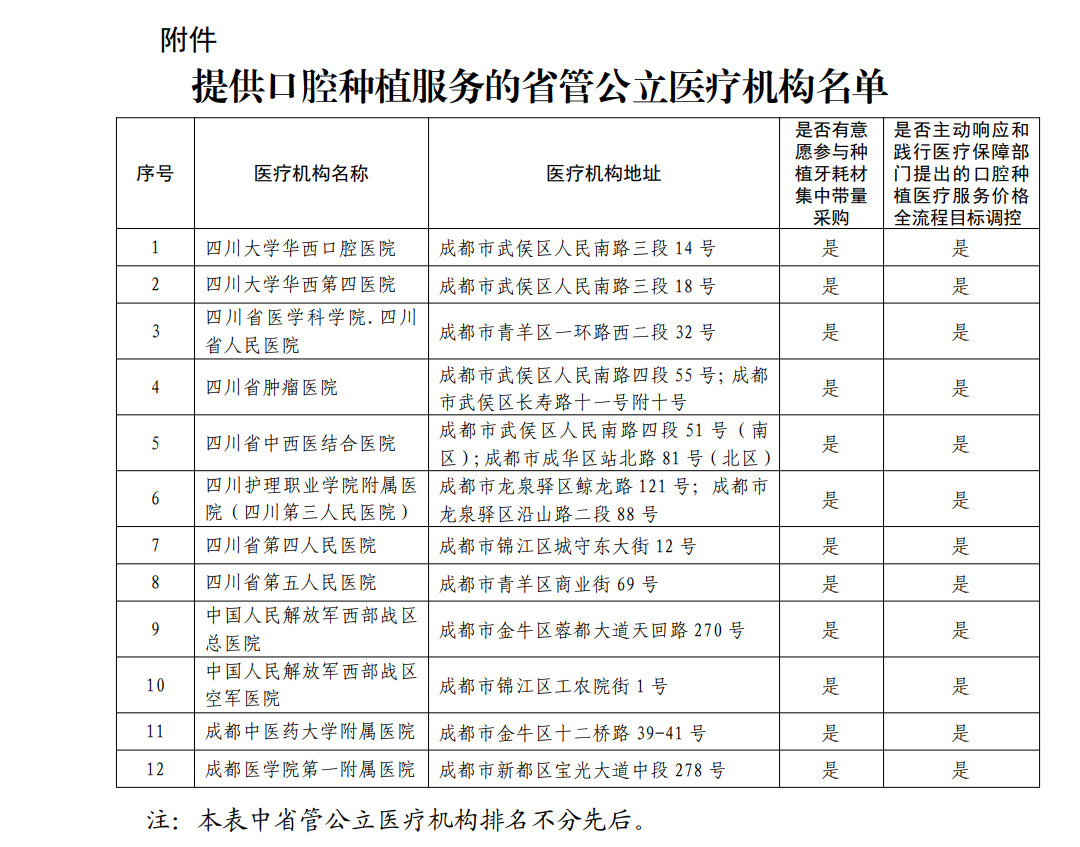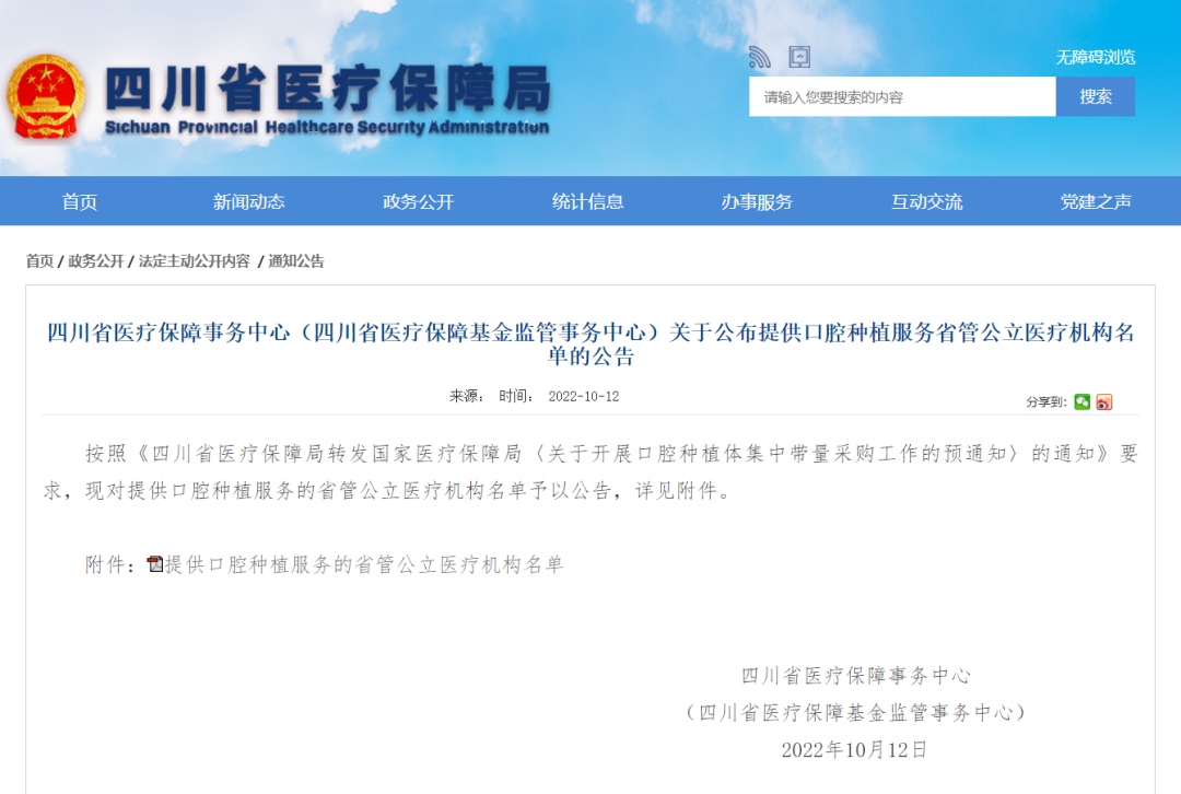 近日,四川省醫(yī)療保障局官網(wǎng)發(fā)布《關(guān)于公布提供口腔種植服務(wù)省管公立醫(yī)療機(jī)構(gòu)名單的公告》,包括四川大學(xué)華西口腔醫(yī)院、四川省人民醫(yī)院、四川省腫瘤醫(yī)院、成都中醫(yī)藥大學(xué)附屬醫(yī)院等在內(nèi)的12家省管公立醫(yī)療機(jī)構(gòu),表示愿參與種植牙耗材集中帶量采購,主動(dòng)響應(yīng)和踐行醫(yī)療保障部門提出的口腔種植醫(yī)療服務(wù)價(jià)格全流程目標(biāo)調(diào)控。