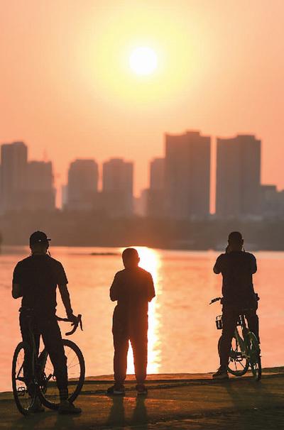 市民在遼寧省沈陽市渾河岸邊駐足欣賞夕陽。 新華社記者 蔡湘鑫攝