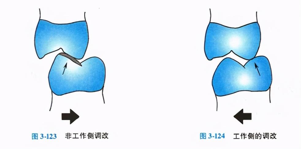 用咬合紙檢查早接觸的位置。在調(diào)節(jié)非工作側(cè)早接觸時(shí),出現(xiàn)在上頜舌尖頰斜面的早接觸點(diǎn),或出現(xiàn)在下頜頰尖舌斜面的早接觸點(diǎn)應(yīng)被消除(圖3-123)。