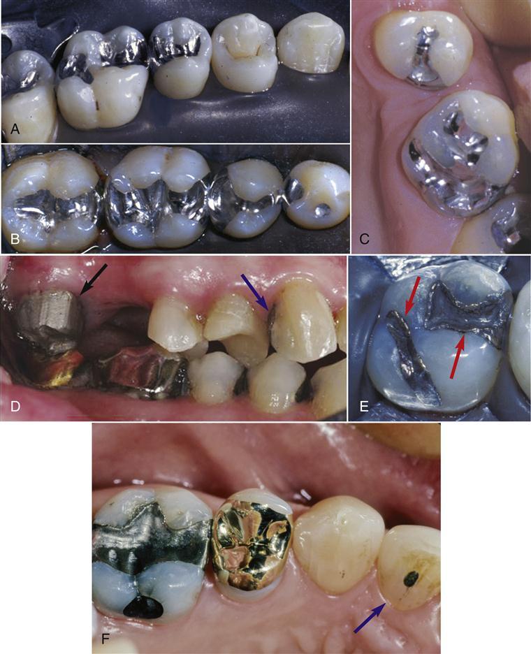 (3)邊緣適合性(marginaladaptation):修復(fù)體的鄰接檢查合適后,在修復(fù)體徹底就位的情況下仔細(xì)觀察冠邊緣的情況。合適的冠邊緣不應(yīng)存在過長(over-extended)、過短(under-ex—tended)、過厚以及與頸緣之間有間隙的情況(圖3—119)。冠邊緣與頸緣之間的間隙大于50p~m的狀態(tài)通常被認(rèn)為是間隙過大,這樣大的間隙意味著探針的尖可以探入冠邊緣與頸緣之間。位于齦下的冠邊緣的適合度很難檢查,而齦下不適合的冠邊緣對(duì)牙齦的健康為有害。