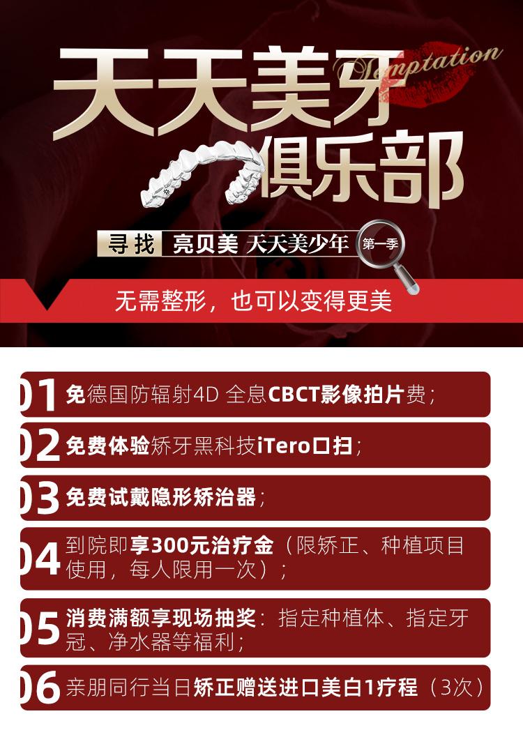 據(jù)悉,亮貝美口腔醫(yī)院近日推出了"天天美牙俱樂部尋找天天美少年(第一季)"限時報名活動,如果您或您身邊的朋友正在被牙齒畸形或面型問題困擾,可以點擊閱讀原文鏈接報名預(yù)約,限量領(lǐng)取以下福利: