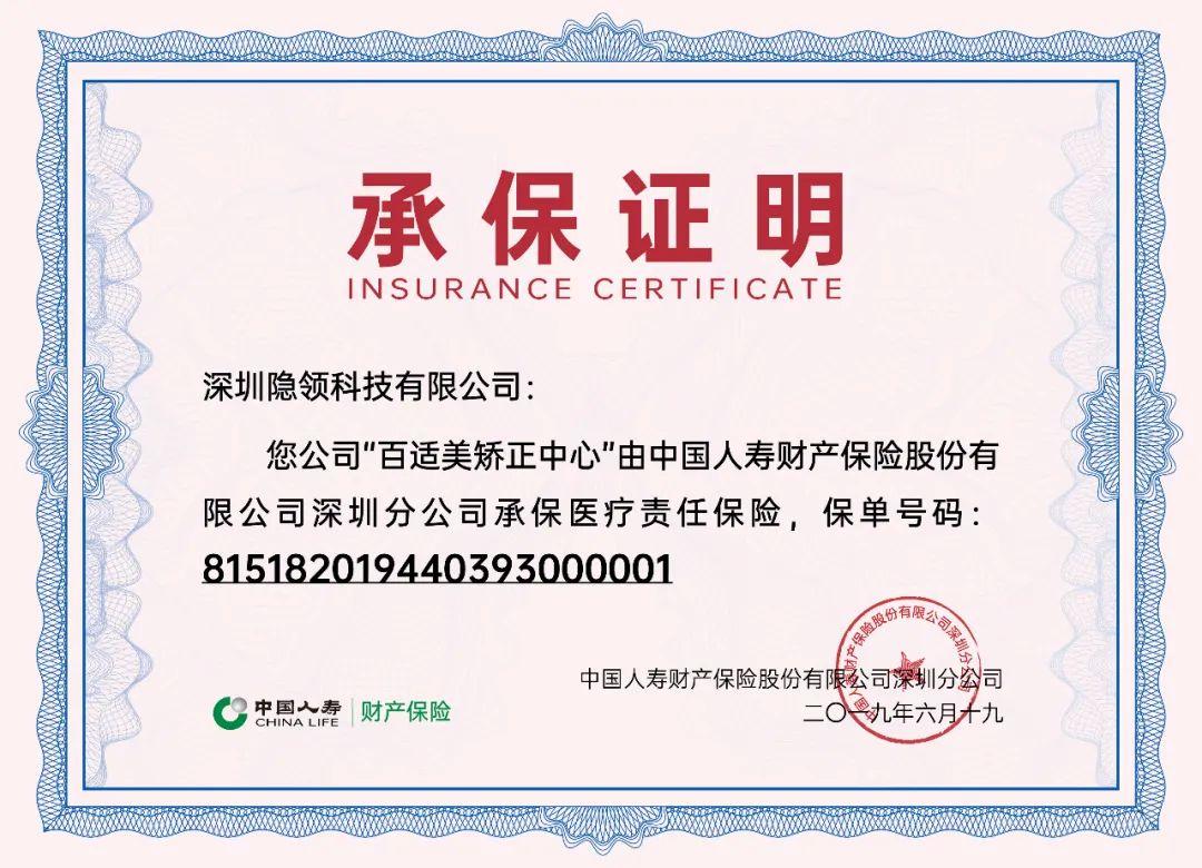 百適美矯正中心為每一位進(jìn)行矯正的患者,在中國(guó)人壽財(cái)產(chǎn)保險(xiǎn)股份有限公司,購(gòu)買醫(yī)療責(zé)任保險(xiǎn),用戶凡遵醫(yī)囑佩戴矯治器滿3個(gè)月,牙齒無(wú)移動(dòng)的,可免費(fèi)重新設(shè)計(jì)方案或者選擇終止矯正服務(wù)。