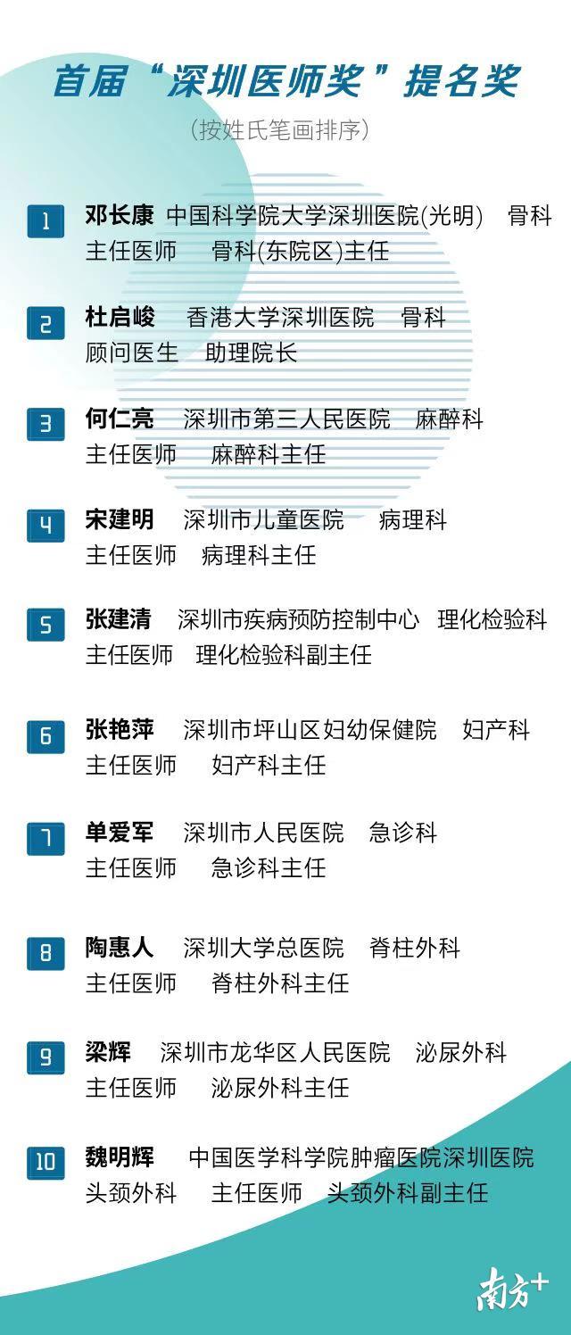 為了尋找2019年度的醫(yī)師,深圳舉辦了首屆“醫(yī)師獎”評選活動。經(jīng)過初審、網(wǎng)絡(luò)投票、專家評審和評議、公示后,20位的醫(yī)生脫穎而出,劉雪燕醫(yī)生等10人獲首屆“深圳醫(yī)師獎”,鄧長康醫(yī)生等10人獲首屆“深圳醫(yī)師獎”提名獎。