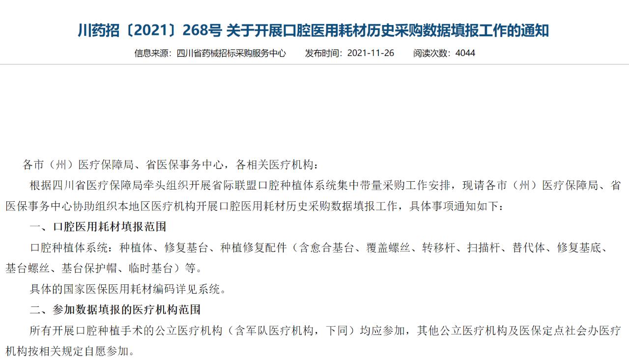 種植牙集采在一些地方上已經(jīng)悄然開始推進(jìn)。2021年11月18日,四川藥械招標(biāo)采購服務(wù)中心發(fā)布通知,開始采集口腔類高值醫(yī)用耗材產(chǎn)品信息。范圍涵蓋口腔種植體系統(tǒng)所需的醫(yī)用耗材,種植體、修復(fù)基臺、種植修復(fù)配件等。11月26日,四川又下發(fā)了要求所有開展口腔種植手術(shù)的公立醫(yī)療機(jī)構(gòu)填報(bào)數(shù)據(jù)的通知。