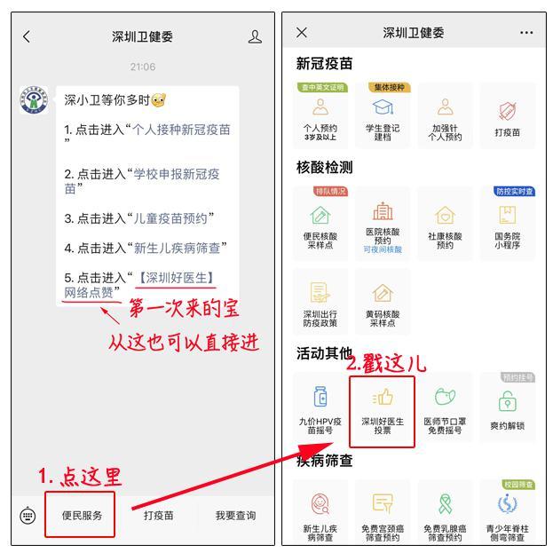 ③ 進(jìn)入“深圳衛(wèi)健委”,在公眾號菜單欄中,點(diǎn)擊“便民服務(wù)”-“深圳好醫(yī)生投票”。