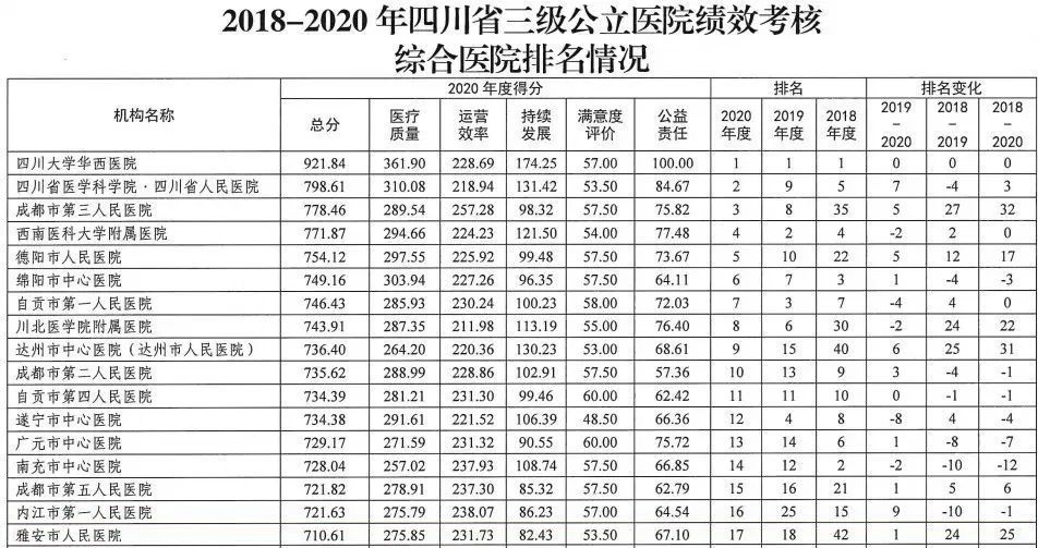 近日,四川省衛(wèi)健委公布了全省2020年度公立醫(yī)院績(jī)考核結(jié)果,資料顯示,此次全省有164家三級(jí)公立醫(yī)院參評(píng)。四川省三級(jí)公立醫(yī)院績(jī)考核工作于2019年啟動(dòng),主要由醫(yī)療質(zhì)量、運(yùn)營(yíng)率、持續(xù)發(fā)展、滿意度評(píng)價(jià)和社會(huì)益5個(gè)方面構(gòu)成。值得一提的是,從今年的公開排名指標(biāo)來看,社會(huì)益被替換為了公益責(zé)任。