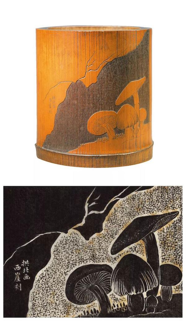 留青陽文金城畫菌菇圖竹筆筒