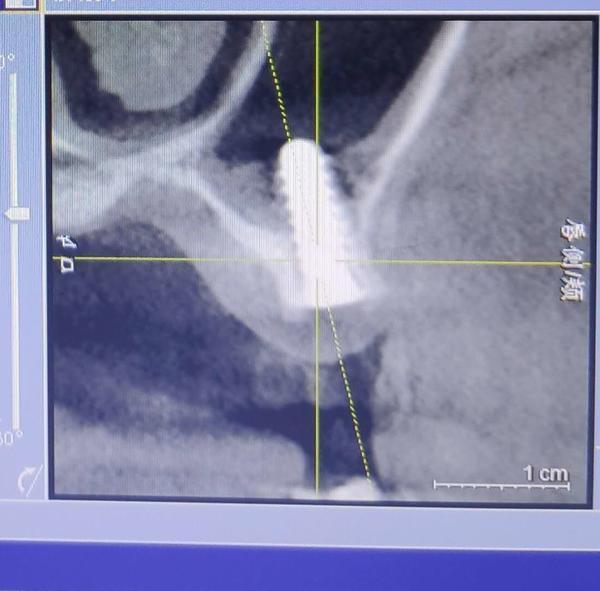 葉女士做出的影像檢查結(jié)果顯示,其中一顆植體已經(jīng)進(jìn)入上頜竇腔內(nèi)。