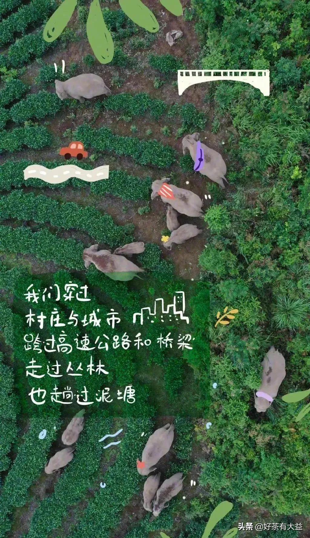 從普洱市墨江縣,再到玉溪市元江縣,再到昆明,數(shù)百公里的路途,它們自由地從森林游蕩到鄉(xiāng)村,從鄉(xiāng)村又逛到城市。一路上走走玩玩,來來回回散個(gè)步。連睡姿都整齊劃一,堪稱訓(xùn)練有素。偶爾喝點(diǎn)家鄉(xiāng)糯米酒,或者到新農(nóng)村家庭參觀一下。還順便造訪了幾座茶山,踏入千年古寨的村民家中,讓空氣中漂浮著古茶的芬芳。