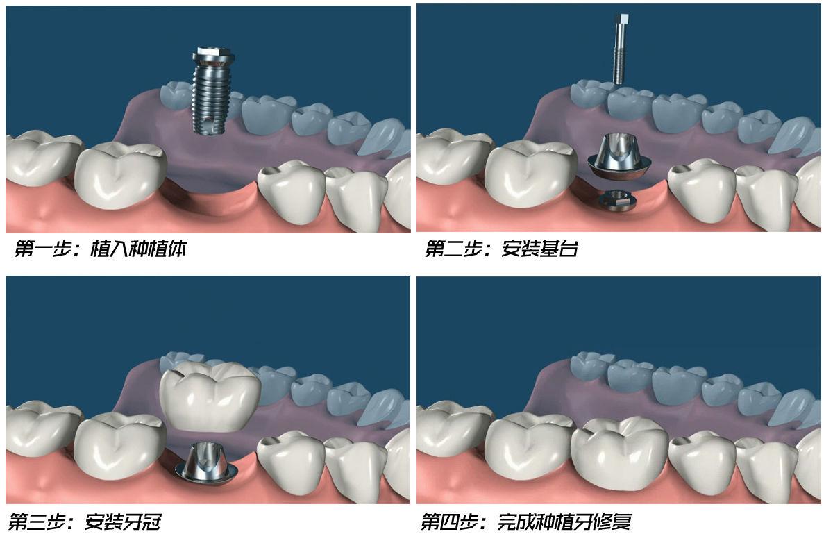 手術過程就是將種植體植入患者的牙體缺失處,待其傷口愈合,種植體與牙槽骨結合牢固后,將基臺安裝在種植體上,再將人工牙冠安裝在基臺上,形成完整而堅固的人工牙體。