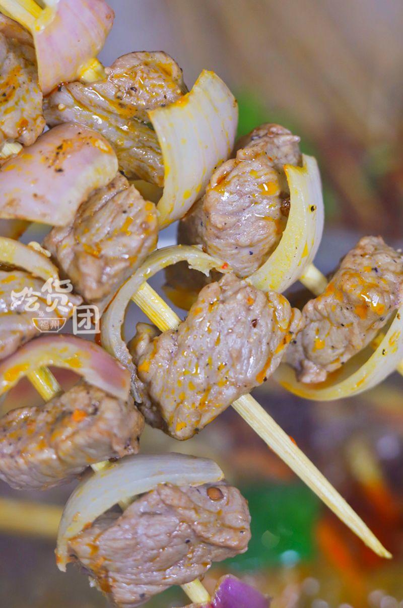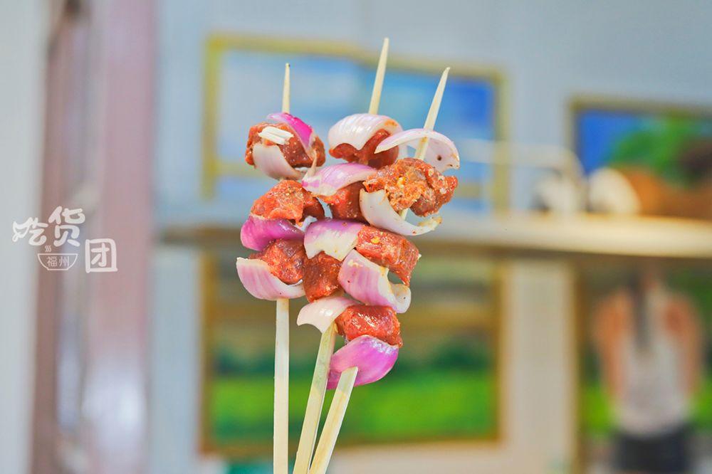 串上的牛肉只能用「塊」來(lái)形容,每一塊直徑都有3cm左右,用牙齒撕扯時(shí)肉汁會(huì)洶涌地躍進(jìn)你舌尖。對(duì)啦,連同洋蔥一起吃更香!