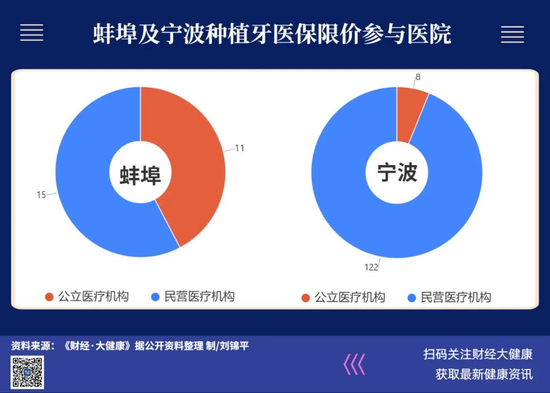 《財(cái)經(jīng)·大健康》梳理發(fā)現(xiàn),此次參與蚌埠種植牙限價(jià)的醫(yī)院中,公立醫(yī)院11家,民營機(jī)構(gòu)為15家;寧波則為公立醫(yī)院8家,民營機(jī)構(gòu)為122家。