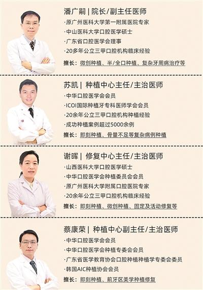 在口腔醫(yī)療機構里,一名患者通常由一名主治醫(yī)師負責,往往會出現(xiàn)傳統(tǒng)種植方案設計無法滿足患者需求或因醫(yī)生經驗不足無法進行種植等問題。廣州暨博口腔 “疑難種牙特診小組”聚集了多名有三甲醫(yī)院口腔科工作經驗的名醫(yī),潘廣嗣院長、蘇凱主任、謝暉主任等臨床經驗均在20年以上、種牙超過10000顆,在數(shù)字化種植、疑難復雜種植方面經驗豐富,專業(yè)為每一位患者提供每一顆牙的病例討論,嚴把質量關。