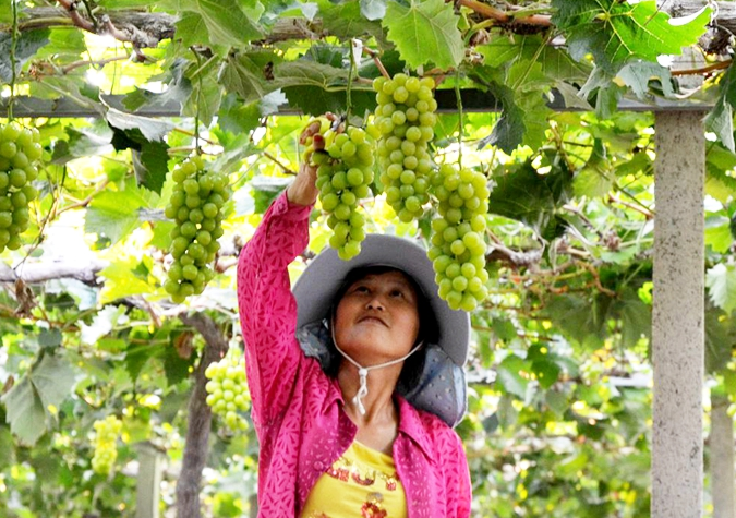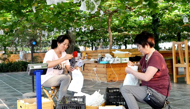 眼下正是葡萄成熟季節(jié),需要大量的勞動(dòng)力,有許多附近的村民都來到基地打工,他們一手拿租金,一手拿工資,實(shí)現(xiàn)了“雙收益”。
