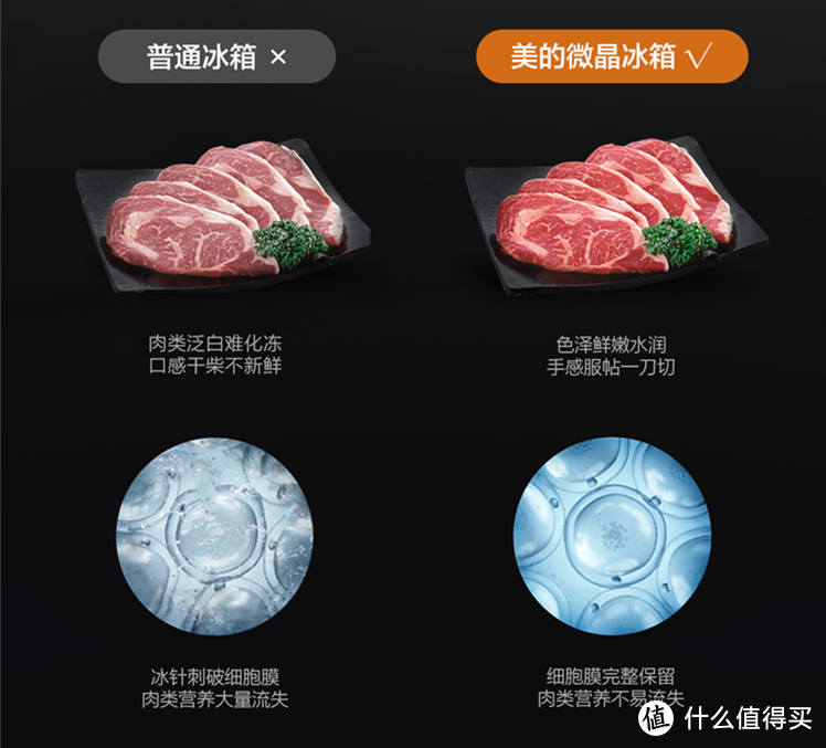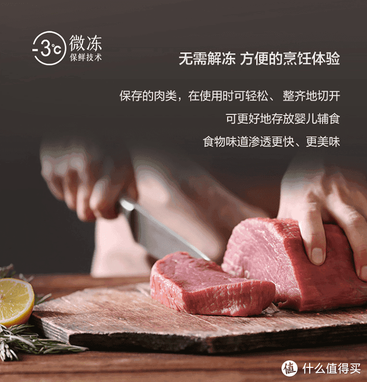 其工作原理就是通過技術(shù)讓艙內(nèi)溫度始終保持在-5℃,讓艙內(nèi)不形成冰針,這樣就不會刺破細胞,這樣就能夠鎖住食物營養(yǎng),對于一些比較難保鮮的肉類來說微晶一周鮮可以讓其保存在一周以上,同時切肉的時候手感服帖。