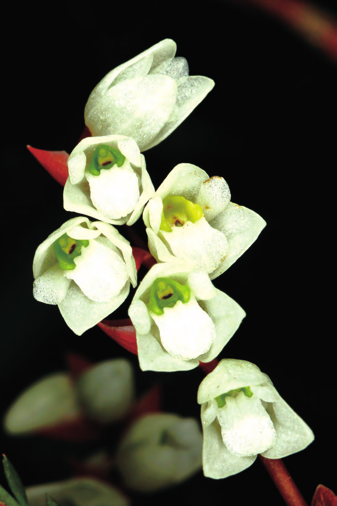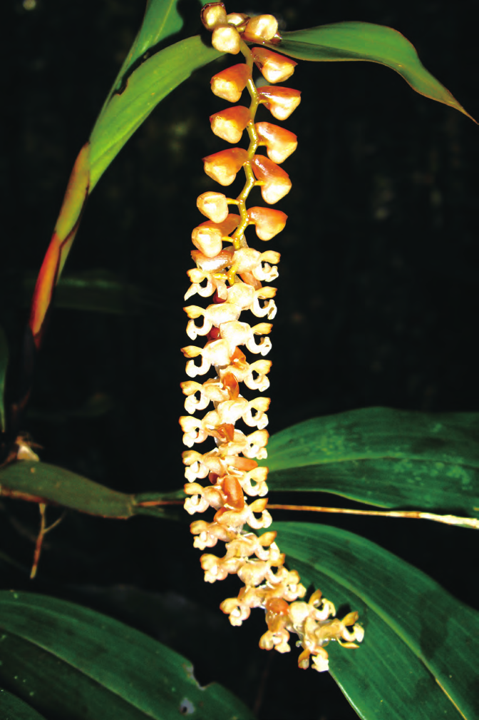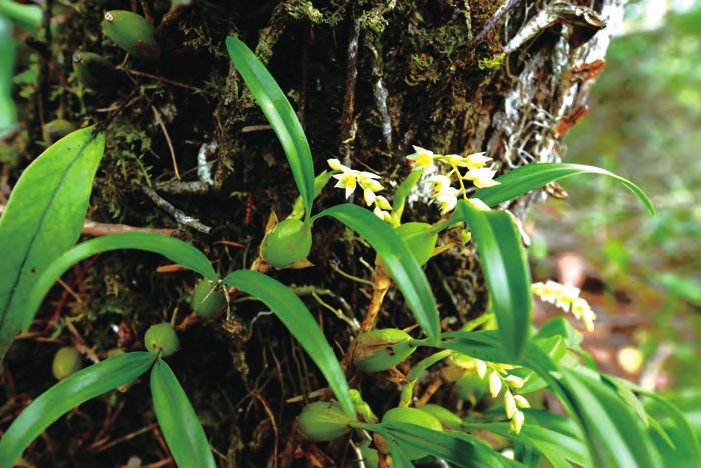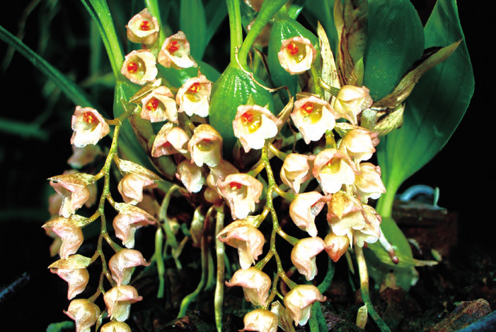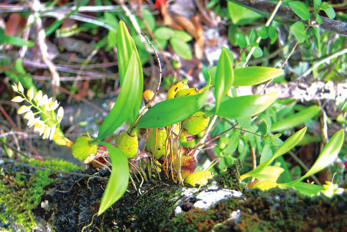 石仙桃為附生或石生,根狀莖粗壯,具匍匐狀,葉革質(zhì),狹橢圓形、卵形或長圓形,總狀花序具密生穗狀多花,花白色、粉紅色、淺褐色、淡綠色、淡黃色或淺玫瑰色。4 ~ 5 月或7 ~ 10 月。