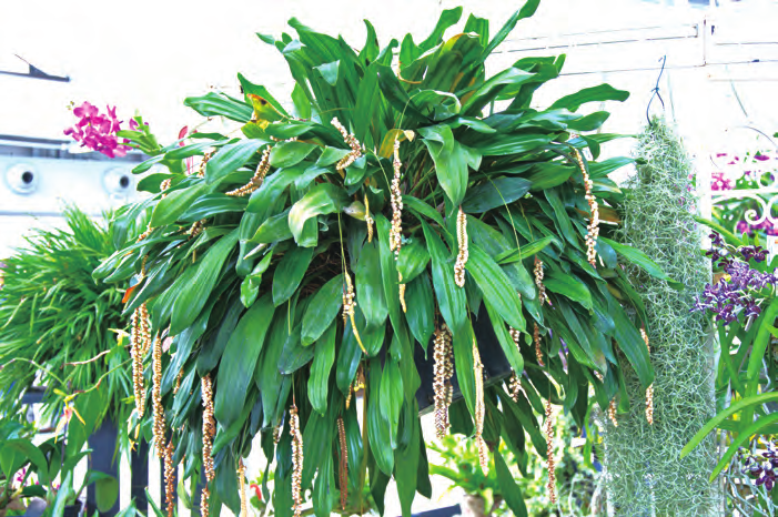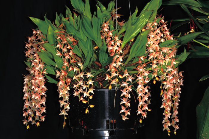肥料 石仙桃比較喜肥,但忌施高濃度肥料。一般每個主分枝每年僅長出1 個新假鱗莖,因此在旺盛生長期間,建議施用水溶性肥料和緩釋肥料兩種,以其培養(yǎng)出肥大的球莖。石仙桃對 N、P、K 的需求不同,一般馴化苗栽種 1 周后,用花寶 1 號 4000 ~ 5000倍液噴淋透基質(zhì) 1 次,隔 3 天再淋施 1次。1 ~ 3 周后,根據(jù)小苗干濕情況隔5 天稀釋 3000 ~ 4000 倍液進(jìn)行噴淋施1 次。當(dāng)幼苗開始長葉后,小苗階段用N、P、K 比例為 2 ∶ 1 ∶ 1 的水溶性復(fù)合肥料,如花寶 5 號、花多多 10 號,濃度為 3000 ~ 4000 倍液,每 10 ~ 15天施用 1 次,并每 5 ~ 6 個月施用奧綠肥 5 號長緩釋肥 1 次,以及每月 1 次噴施 3000 倍液的花多多 36 號 TE 微量肥。中苗階段,則應(yīng)以 N、P、K 的比例 為 2 ∶ 1 ∶ 1 和 1 ∶ 1 ∶ 1 兩 種 肥料 2000 ~ 3000 倍液交替施肥,每隔7 ~ 10 天施用 1 次,如花寶 5 號、花寶2 號、花多多 10 號、花多多 1 號,并每 3 ~ 4 個月施用奧綠肥 301 號長控釋肥 1 次,以及每月噴施 3000 倍液的花多多 36 號 TE 微量肥 1 次。大苗階段,以 N、P、K 比例為 1 ∶ 1 ∶ 1 和1 ∶ 2 ∶ 2 的兩種肥料以 1000 ~ 2000倍液交替施用,每隔 7 ~ 15 天施 1 次,如 花 寶 2 號、 花 多 多 1 號 和 11 號,并每隔 3 ~ 4 個月施用奧綠肥 601 號(10-11-18+2MgO+TE)1 次, 每 月 繼續(xù)噴施 1 次 3000 倍液的花多多 36 號TE 微量肥。在進(jìn)入花芽生長期,應(yīng)改施用以 N、P、K 比例為 1 ∶ 3 ∶ 2 為主的肥料,如花寶 3 號或花多多 2 號1000 ~ 2000 倍液的濃度每周淋施 1 次,直至抽出花梗時停止施肥?;ê笠鶕?jù)季節(jié)施肥,建議在夏末和秋季使用低氮高磷的肥料,以促進(jìn)下一季更好地開花,并使新長出的假鱗莖在冬季前變硬成熟。