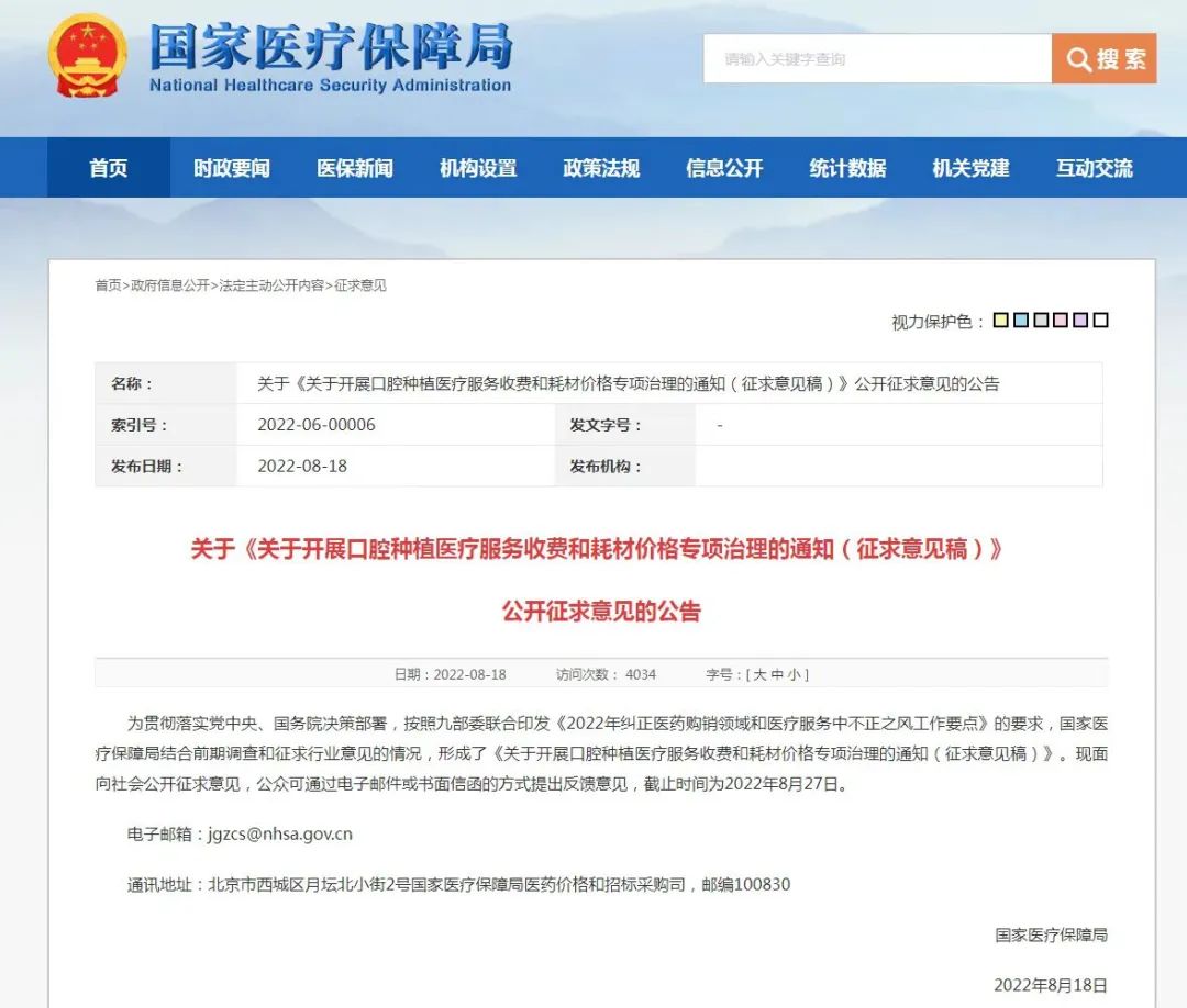 長(zhǎng)期以來,口腔種植領(lǐng)域收費(fèi)不規(guī)范、費(fèi)用負(fù)擔(dān)重等問題困擾著群眾,各方關(guān)于整頓秩序、降價(jià)減負(fù)的呼聲強(qiáng)烈。8月18日,醫(yī)保局官網(wǎng)公布了《關(guān)于開展口腔種植醫(yī)療服務(wù)收費(fèi)和耗材價(jià)格專項(xiàng)治理的通知(征求意見稿)》。其中涉及規(guī)范收費(fèi)方式、強(qiáng)化價(jià)格調(diào)控、組織集中采購等多項(xiàng)內(nèi)容,回應(yīng)了民生關(guān)切。