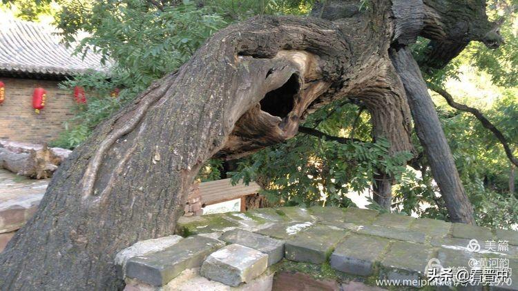 走過(guò)龍門(mén)石橋便步入村中石徑。石徑彎道口兩株古槐夾道相迎。左側(cè)一株已空心,憑著僅存的樹(shù)壁掙扎、扭曲、偃仰著朝路口盤(pán)升,在路口的上方又撐開(kāi)綠意盎然的樹(shù)冠。村人怕旺密的樹(shù)冠折斷而用棍支撐;右側(cè)一槐更為古老,粗壯的樹(shù)干需三人合抱,據(jù)說(shuō)有一千二百年樹(shù)齡。這株老樹(shù)也有大段的枯木和大片的郁郁蔥蔥的新枝,下也用棍支撐。兩株老樹(shù)像兩位拄著拐杖返老還童的老人。兩樹(shù)相對(duì)、古道槐蔭、挺立千年,不知迎送了多少南來(lái)北往之人。