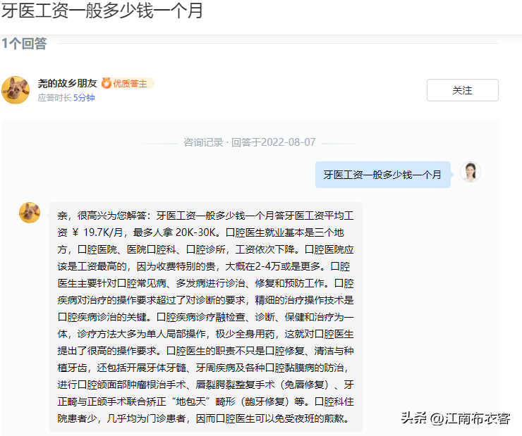6.坐標(biāo):深圳,15年剛畢業(yè)第一個(gè)月2500,一年后5000,拿到執(zhí)業(yè)證后漲到1萬每月,3年后工資漲到2萬每月,學(xué)會(huì)了種植和正畸,工資漲到3萬每月,目前每月工資在稅后5萬左右。