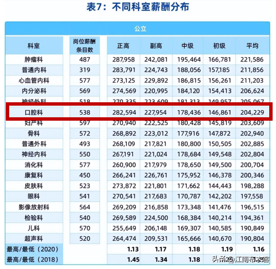 根據(jù)丁香人才發(fā)布的《2021 年度中國醫(yī)院薪酬調(diào)研報(bào)告》,對(duì)包括京滬多所醫(yī)院在內(nèi)的全國190家公立醫(yī)院19 個(gè)熱門科室進(jìn)行工資調(diào)查。公立醫(yī)院職稱不同,牙醫(yī)收入并沒有那么高。其中正高級(jí)年工資收入28萬(每個(gè)醫(yī)院正高級(jí)職稱醫(yī)生稀少),平均年工資只有20萬左右。
