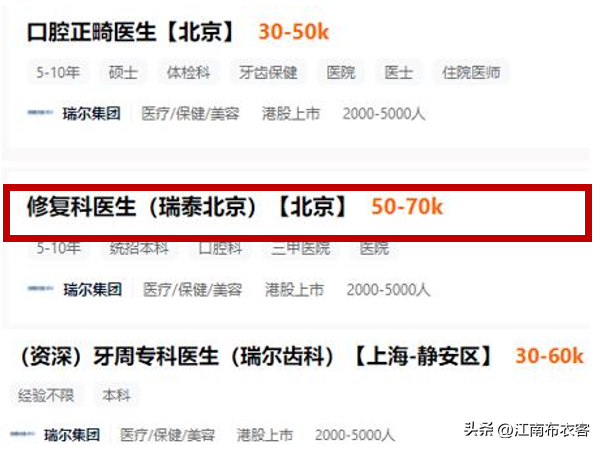 私立牙科醫(yī)療上市公司瑞爾集團(tuán)2021年財(cái)報(bào)顯示:平均每名全職牙醫(yī)能夠?yàn)楣編?87.48萬元的收入,平均每名全職牙醫(yī)的年薪72.38萬元。在其招聘網(wǎng)站上招收的牙醫(yī)月薪均在3萬以上。甚至有其醫(yī)院口腔修復(fù)主任醫(yī)生黃建生則在微博上表示:瑞爾薪資高有年薪600~700萬