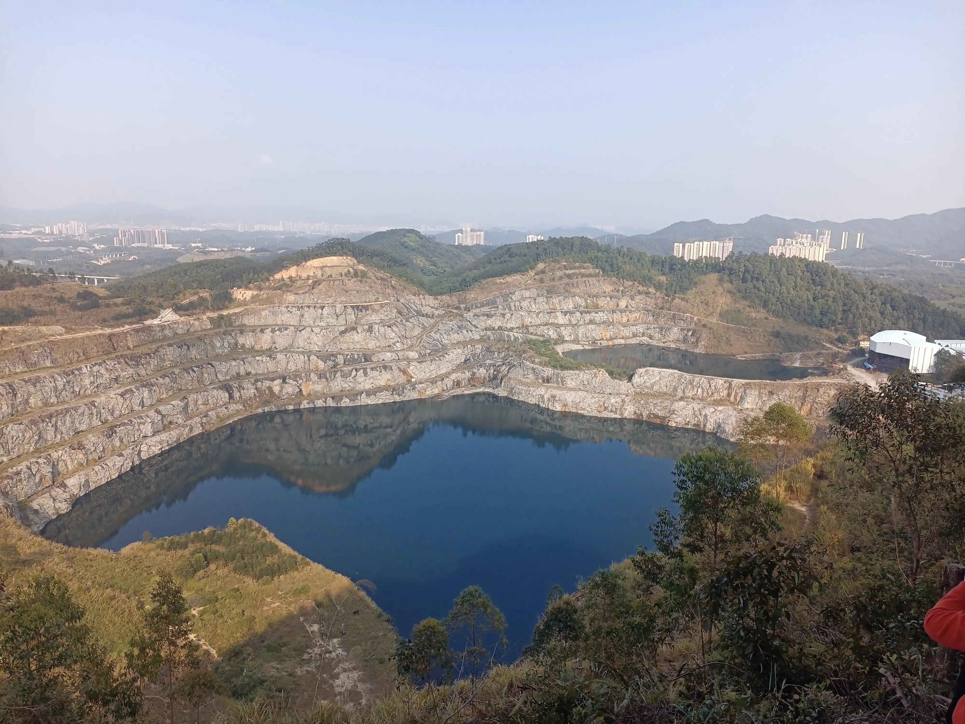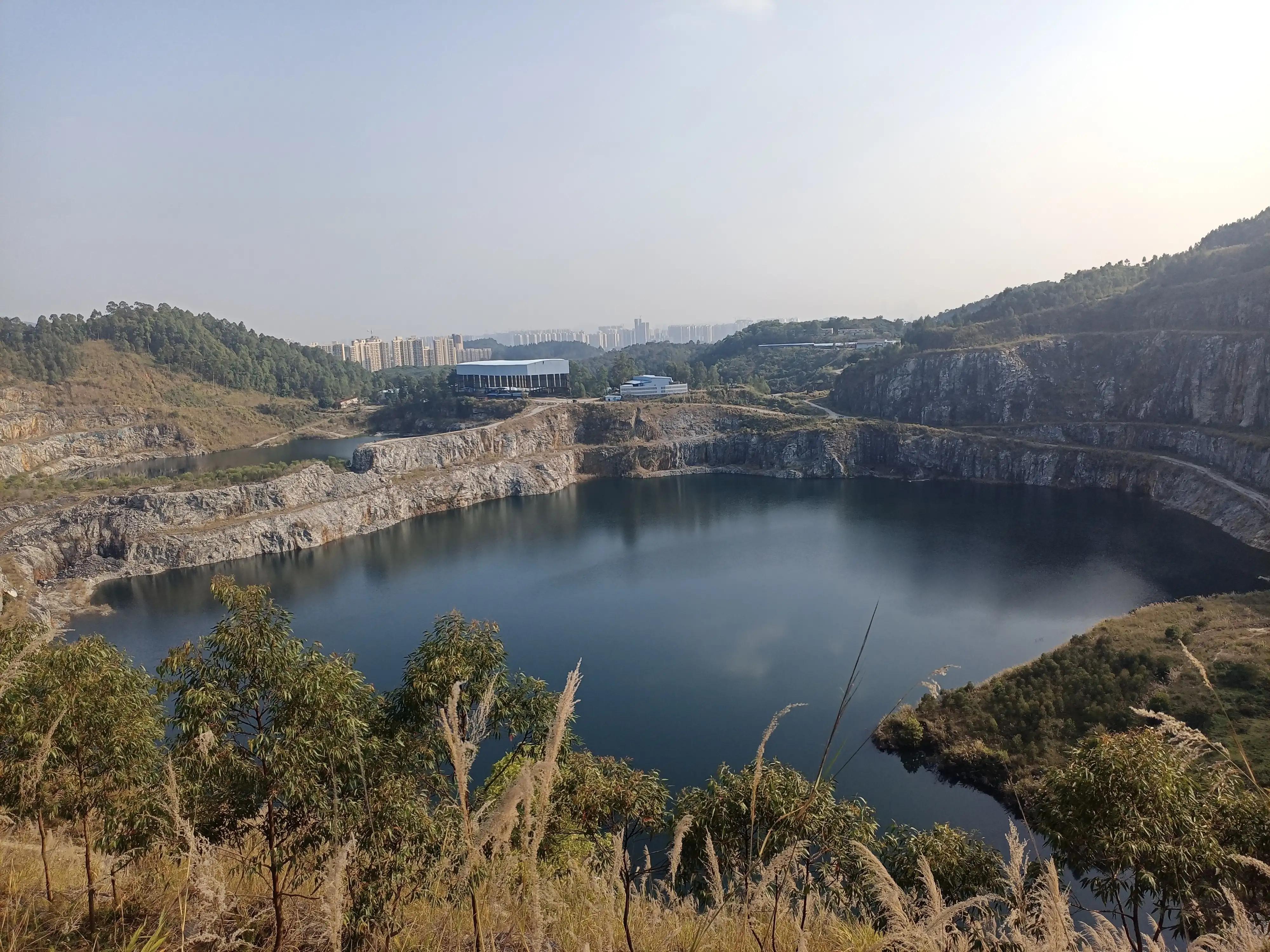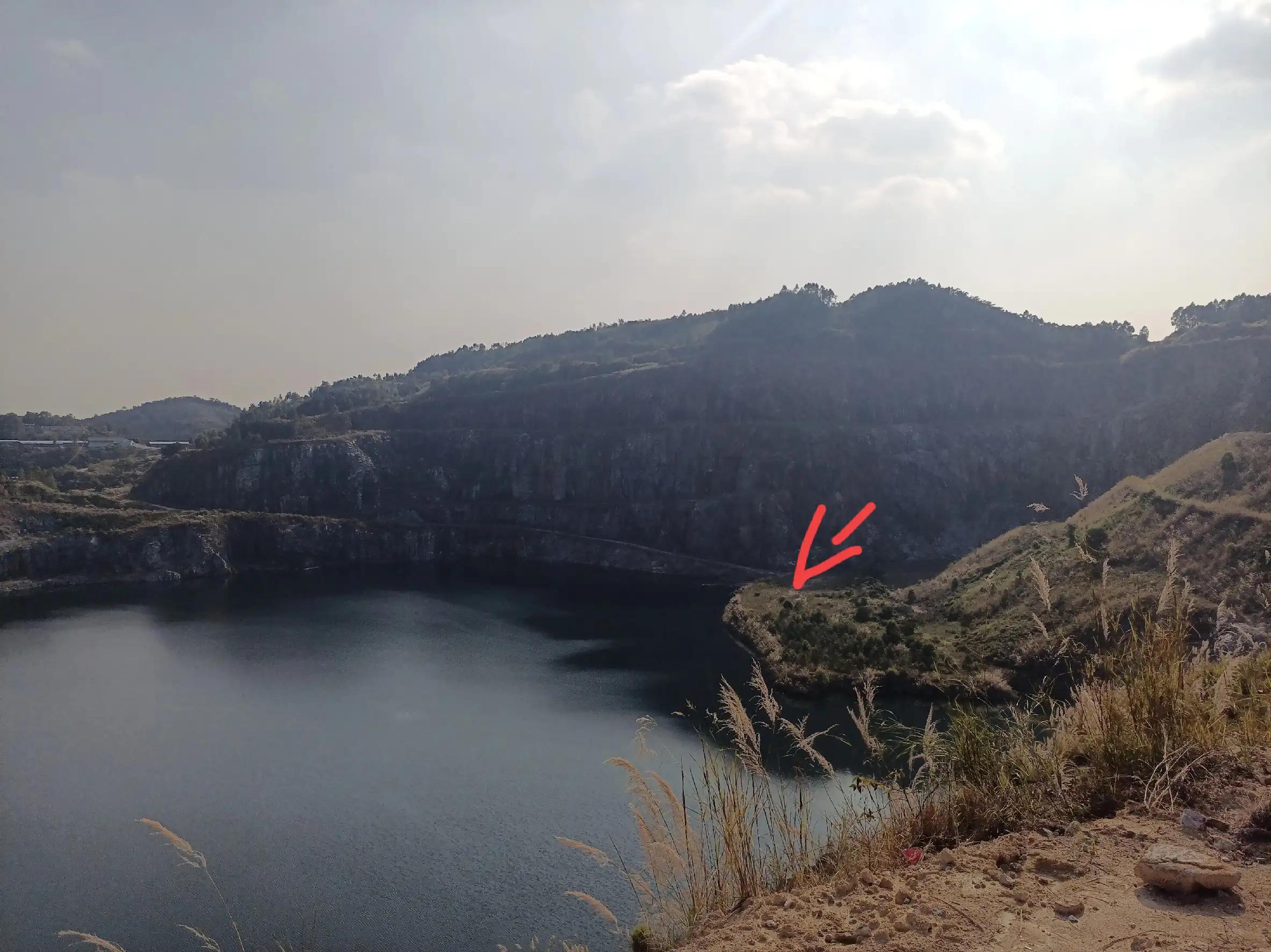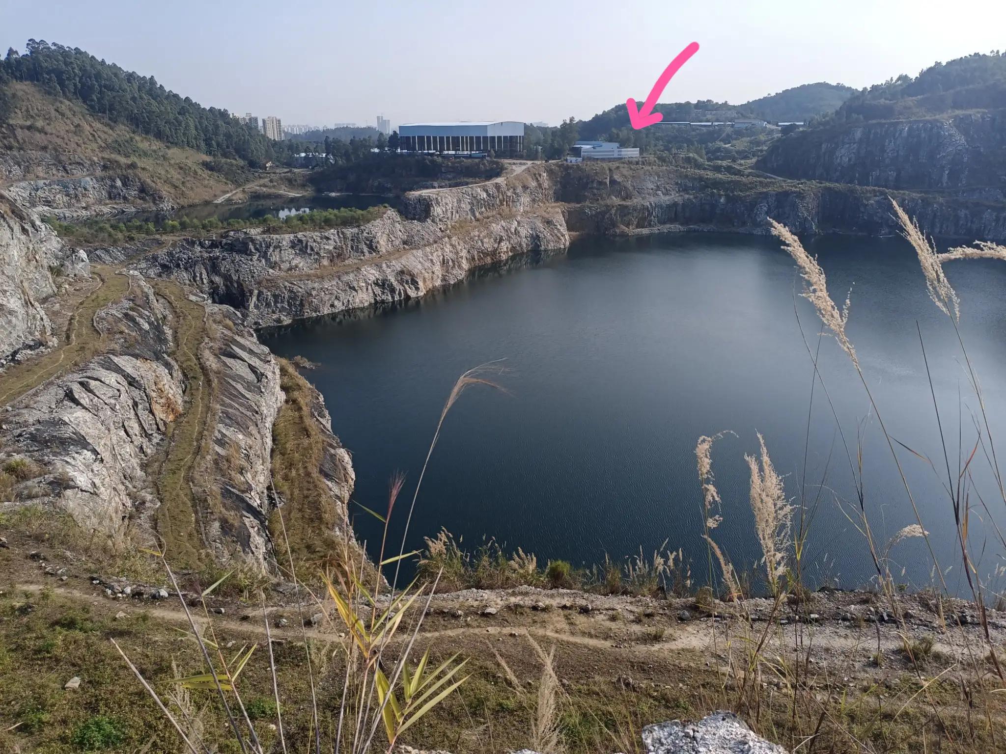 天坑是由采石場采過之后留下的兩個坑,東南的大些,西北的小些,現(xiàn)在還留有廢棄的場房,還有宿舍,以前去我和我朋友到那宿舍里面進去過,宿舍里面還留有2017年的日歷,想來那時還在開采。箭頭所指為廢棄場房,場房那邊現(xiàn)在應(yīng)該是不讓去了,場房那邊是屬于增城區(qū)永寧街道,從那里出去有一條馬路,是可以開車進來的,但是會有保安看管,應(yīng)該是不讓進的。