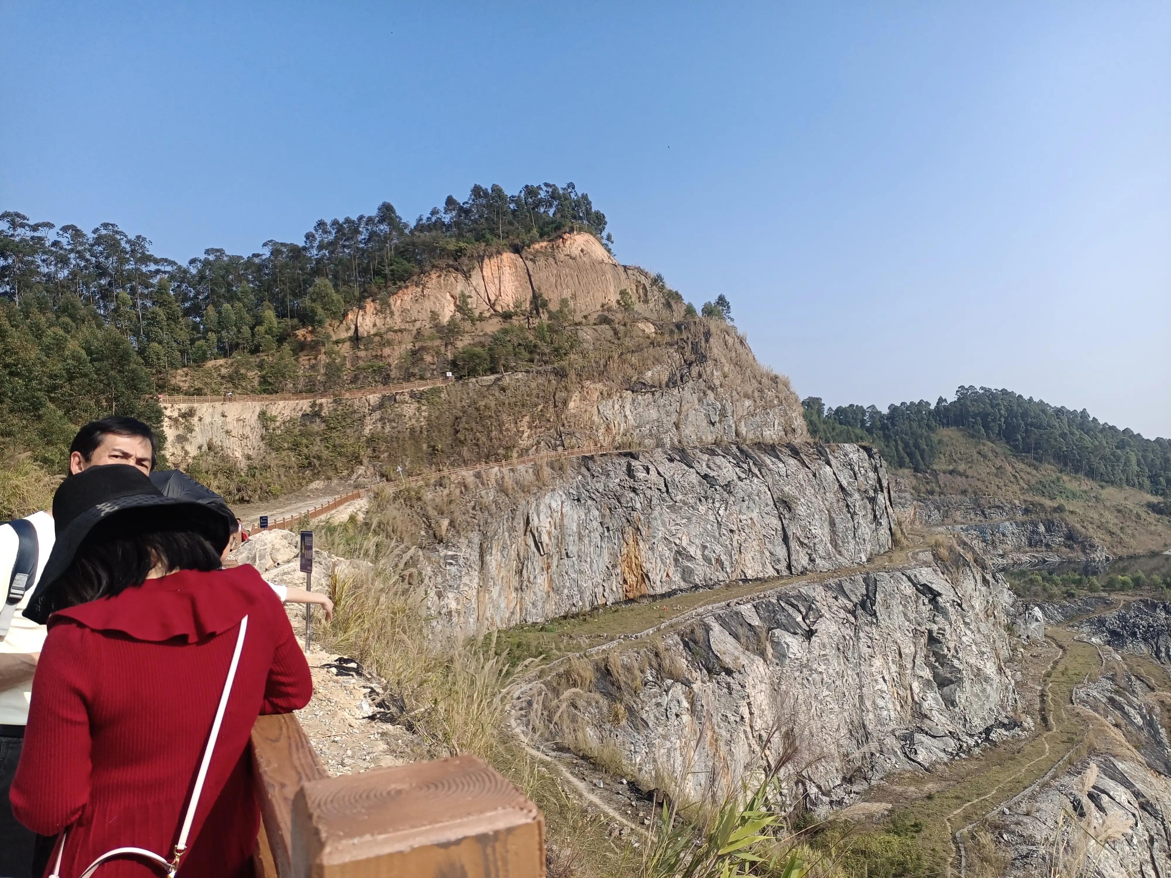 前半年這里是沒有欄桿的,現(xiàn)在為了安裝了攔桿,攔桿只攔一小部分,過去到?jīng)]有攔桿的地方是擋著不讓去的,但是有些人還是翻過攔桿,有的已經(jīng)下到天坑下面接近水面剪頭指的那里了。以前夏天還有人去那里游泳。