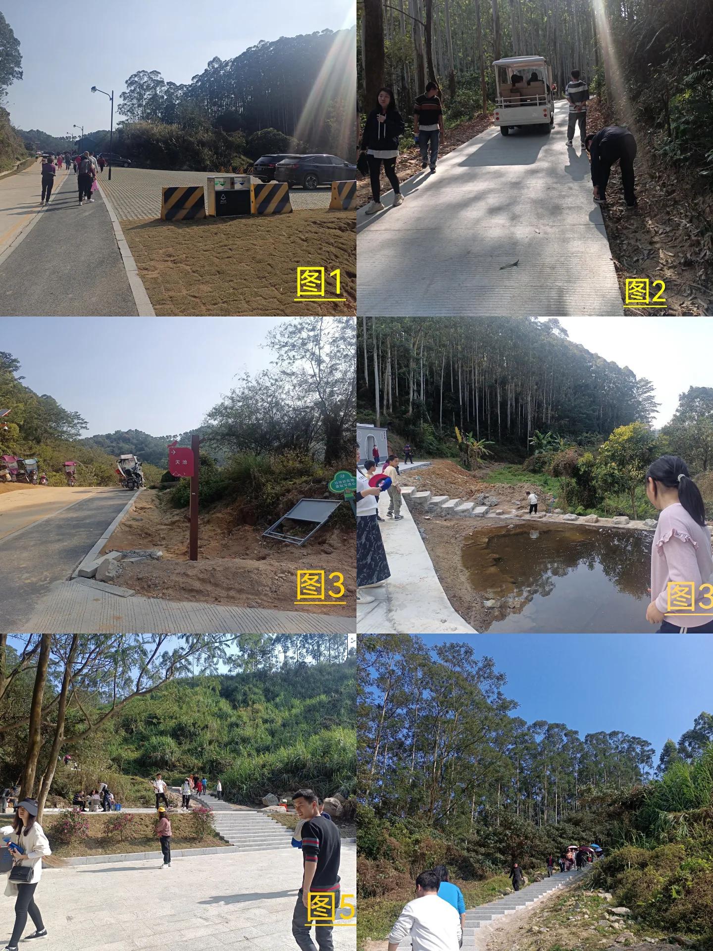 下圖圖1是一個小型停車場,私家車就只能開到這里,圖2是景區(qū)電瓶車還可以往上開,圖3這里要左拐,圖4是一個玩水的地方,圖5這里景區(qū)電瓶車就只到這里了,圖6是后往上的臺階