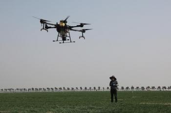在河北省寧晉縣科優(yōu)糧食種植專業(yè)合作社的麥田邊,無人機(jī)正在進(jìn)行病蟲防控和化學(xué)除草作業(yè)。
