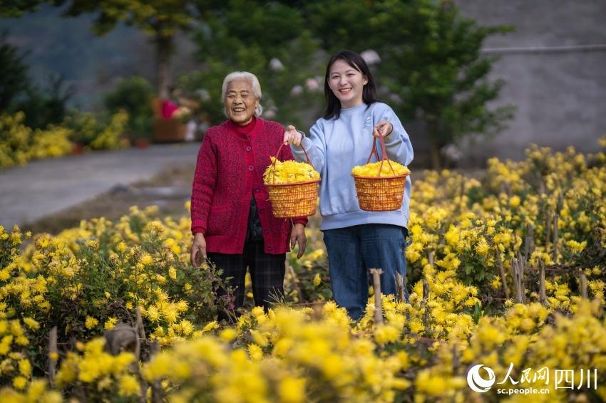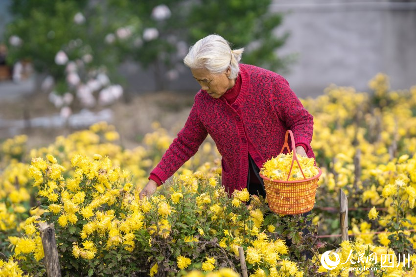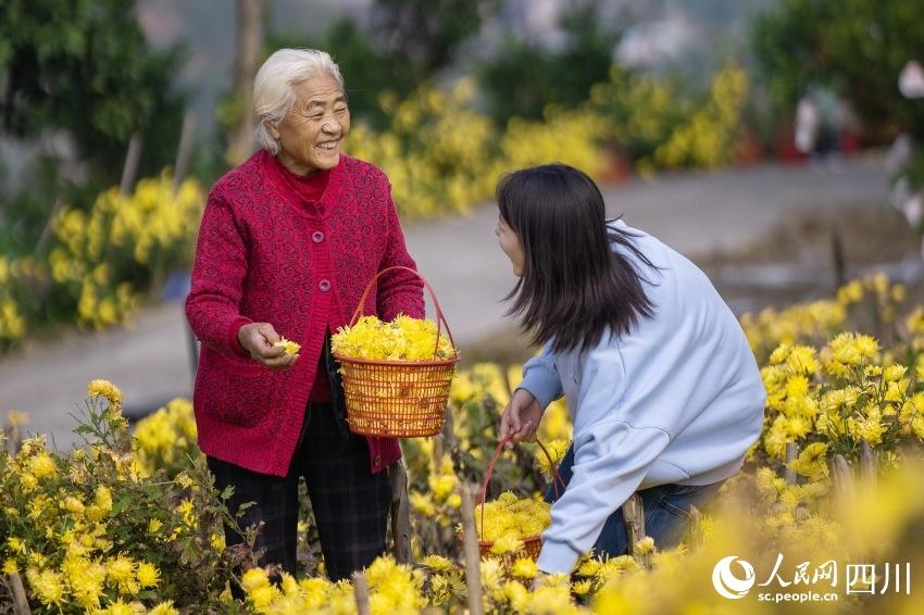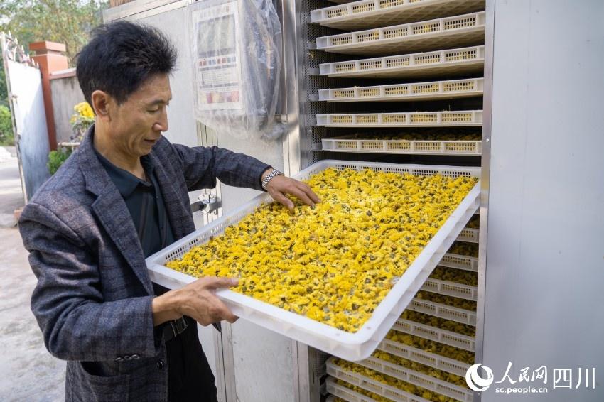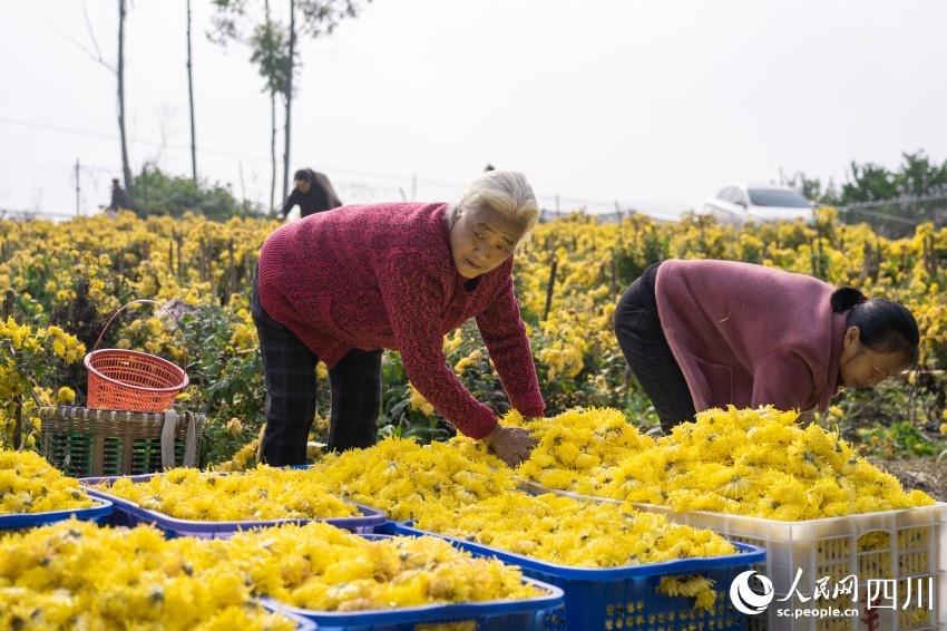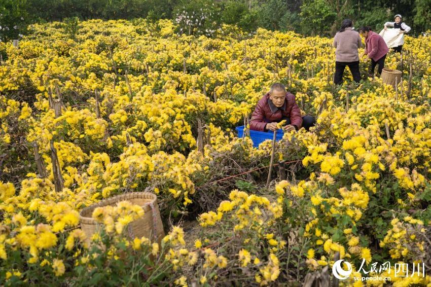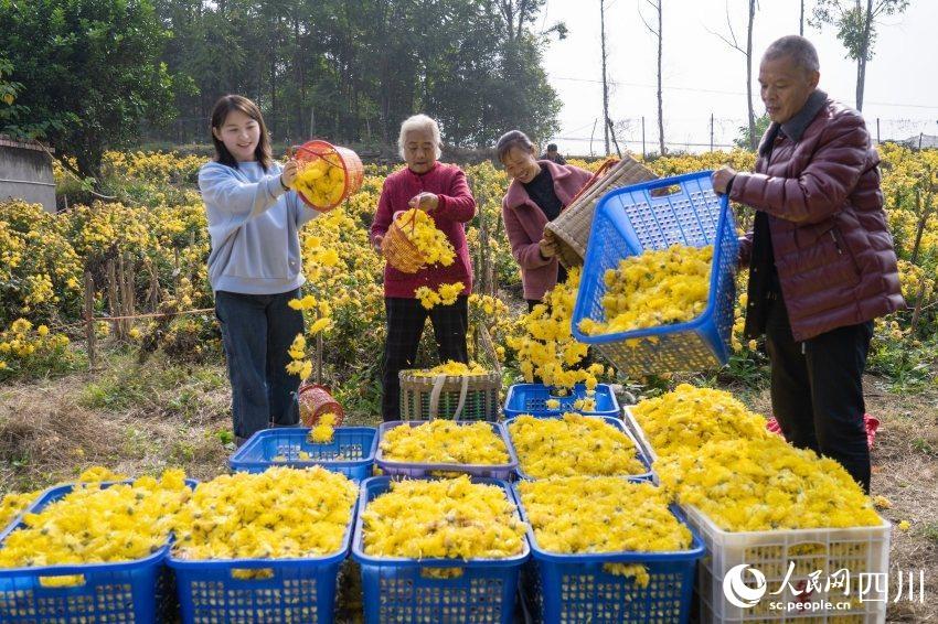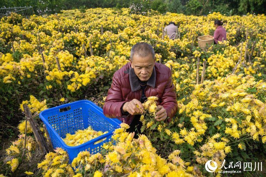 人民網(wǎng)成都11月17日電 11月16日,四川省眉山市彭山區(qū)江口街道石龍村菊花基地種植的金絲皇菊喜獲豐收,當(dāng)?shù)卮迕裾χ烧?、整理、運(yùn)輸、烘干。