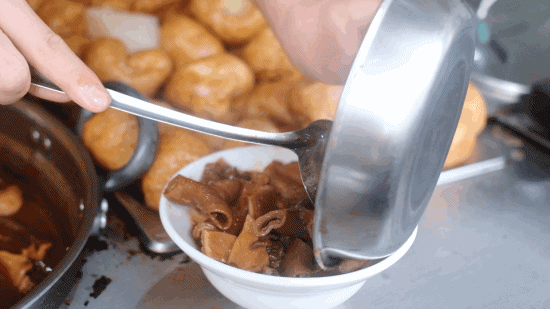 一碗牛雜里扎實(shí)堆滿面筋、蘿卜、牛雜。牛雜更厚,鹵的軟爛,但還留著點(diǎn)筋頭巴腦的嚼頭,和湯汁一起在咀嚼中滋長(zhǎng)味道。怪不得當(dāng)?shù)厝艘f(shuō)一句,“牛雜滾一滾,神仙企唔穩(wěn)”。
