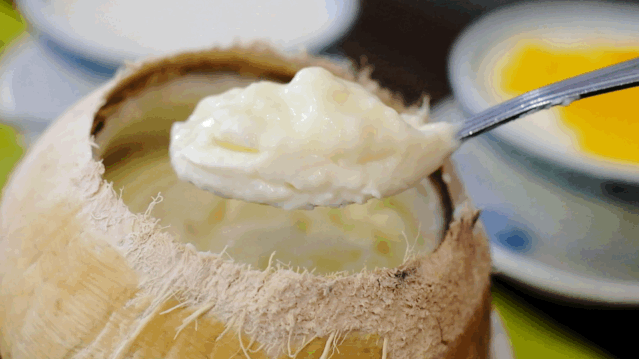 無(wú)論是民信的椰皇雙皮奶,還是仁信的整只椰子燉奶,每桌上總會(huì)有這么一只極具儀式感的椰子殼。水牛奶的實(shí)力在和椰子搶奪風(fēng)頭時(shí),更得以體現(xiàn),縱然是椰子這樣濃烈的香氣,也只能成為水牛奶乳脂香的陪襯。