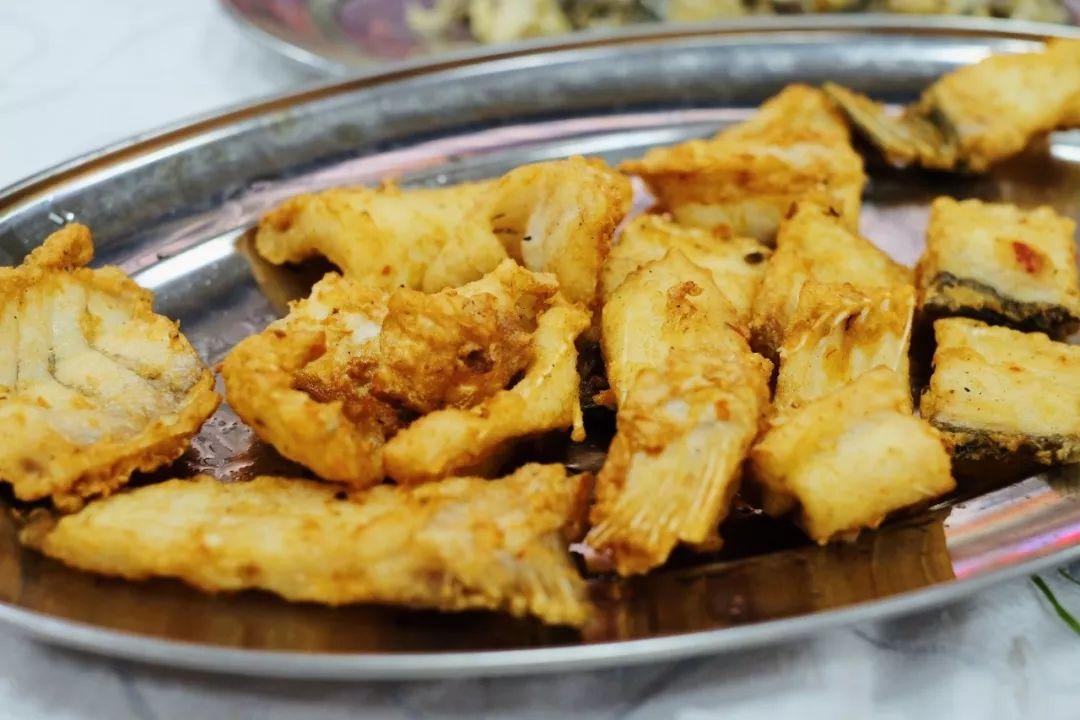 椒鹽魚骨把貼骨肉裹漿炸的酥香,和涼拌魚皮一熱一冷,做出兩種魚鮮味。