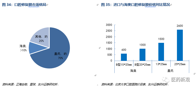 口腔修復(fù)膜產(chǎn)品打破外資壟斷,海奧品牌市占率達10%。國內(nèi)市場中瑞士蓋氏的修復(fù)修復(fù)膜占比達70%,正海生物的海奧口腔修復(fù)膜市場占比約10%以上,鑒于臨床療不劣于進口產(chǎn)品,產(chǎn)品價格遠低于進口產(chǎn)品,進口替代空間充足。
