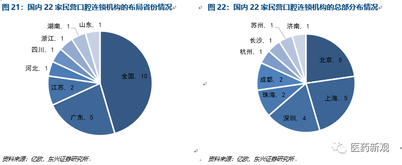 口腔醫(yī)療消費市場結(jié)構(gòu)區(qū)域化,民營資本涌入經(jīng)濟發(fā)達區(qū)域。口腔醫(yī)療為消費醫(yī)療,相比普通醫(yī)療而言,擁有更多的消費屬性??谇会t(yī)療服務(wù)在擁有更大消費能力的一線二線城市發(fā)展迅速。22家的民營口腔連鎖機構(gòu)中的10家口腔機構(gòu)在全國范圍內(nèi)進行布局,其余5家在廣東布局,2家在江蘇布局。22家口腔機構(gòu)中有14家的總部位于北京、上海、深圳一線城市,在珠海、成都分別有2家。