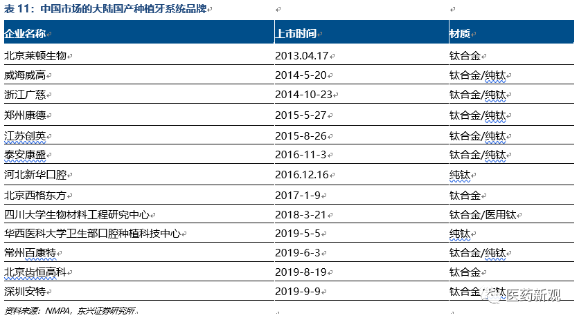 核心種植體由外資壟斷,國產(chǎn)品牌跟隨滲透。根據(jù)Straumann統(tǒng)計來看,2018年種植牙行業(yè)上游的種植體的市場格局中CR5=71%,其中Straumann市占率第一,高達25%。在中國上游種植體的市場中,進口品牌占比約90%以上,國產(chǎn)品牌為10%左右,但是國產(chǎn)品牌不斷進行研發(fā)、追趕國際領(lǐng)先技術(shù),獲批上市的種植體系數(shù)量逐漸增多。