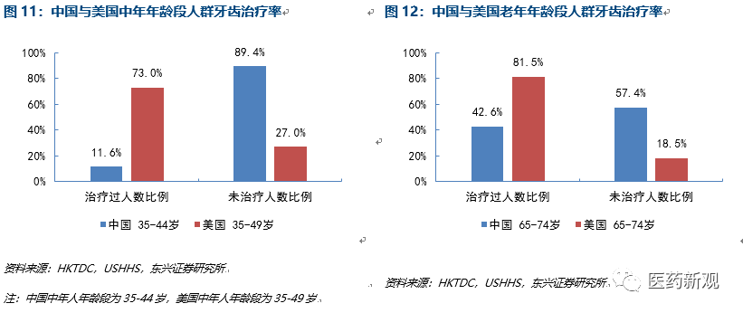 中國中老年人群體牙齒調(diào)節(jié)率相對較低,可提升空間充足。根據(jù)統(tǒng)計情況來看,中國35-44歲中年人群的牙齒調(diào)節(jié)率僅為11.6%,未調(diào)節(jié)率為89.4%,而美國中年人群的未調(diào)節(jié)水平僅為27%;中國65-74歲人群的牙齒調(diào)節(jié)率為42.6%,美國該年齡段人群的調(diào)節(jié)水平為81.5%,國內(nèi)老年人群體的調(diào)節(jié)率雖然有大幅提升,但是依然有57.4%的人未進行調(diào)節(jié)。
