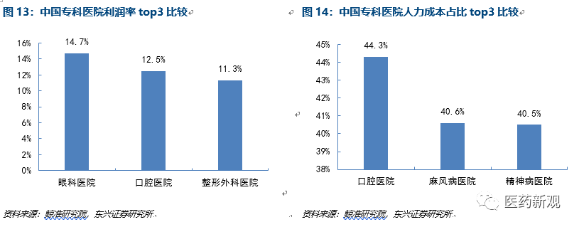 口腔醫(yī)院利潤率位列第二,人力成本占比高。通過比較??泼駹I醫(yī)院的利潤率與人力成本占比指標,口腔醫(yī)院的人力成本占收入比例高,達到44.3%,但利潤率約為12.5%,位列第二,僅次于眼科醫(yī)院,這表明口腔醫(yī)院對醫(yī)生的依賴度大,需要相關(guān)科室醫(yī)生的供給以滿足醫(yī)療服務(wù)需求,且口腔科醫(yī)生的人均盈利高,給口腔醫(yī)院培養(yǎng)醫(yī)生、擴張業(yè)務(wù)提供較大動力。