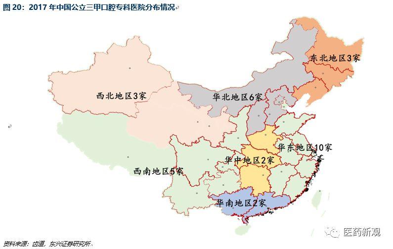 經(jīng)濟發(fā)達地區(qū)擁有優(yōu)質(zhì)醫(yī)療資源與充足的醫(yī)療需求,促成高端三甲口腔醫(yī)院建立。2017年,全國(不含港澳臺)三甲口腔專科醫(yī)院數(shù)量為33家,其中,華東地區(qū)數(shù)量多,醫(yī)院數(shù)量為10家,華北、西南地區(qū)分別為6家、5家。具體從省份來看,經(jīng)濟發(fā)達的省份三甲口腔醫(yī)院布局更多。