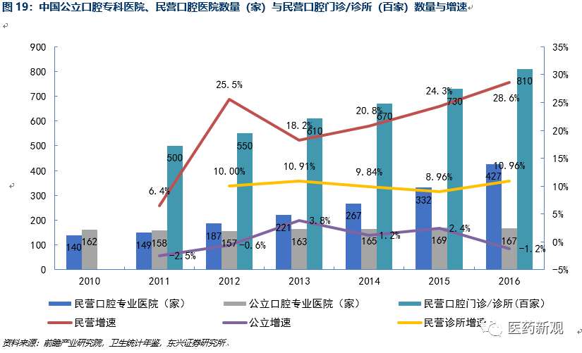 民營口腔??漆t(yī)院發(fā)展迅速。2010年-2016年,民營口腔??漆t(yī)院數(shù)量由140家增加到427家,年均復(fù)合增長率達17.27%,增長速度不斷提高。雖然公立口腔醫(yī)療機構(gòu)受益于醫(yī)保支付,但市場化程度低,規(guī)模擴張緩慢,民營口腔??漆t(yī)院數(shù)量與增速已經(jīng)超過公立口腔??漆t(yī)院發(fā)展情況。2011年-2016年,民營診所/門診由5萬家增加到8.1萬家,數(shù)量占比高。