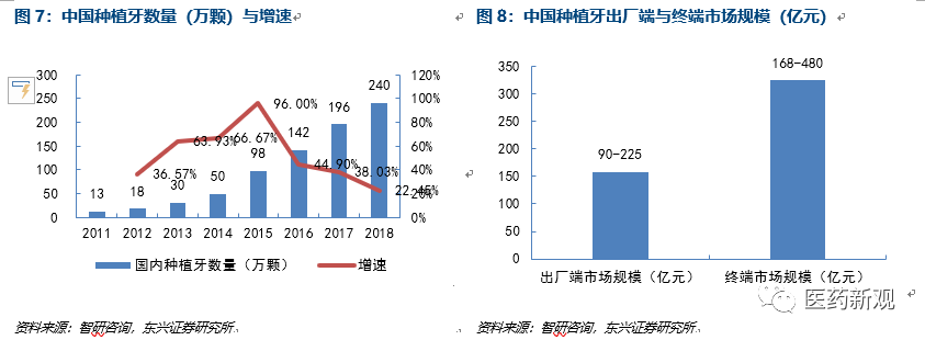 國內(nèi)種植牙年使用量達240萬顆,七年復(fù)合增速52%。在2011年-2018年,國內(nèi)種植牙數(shù)量由13萬顆增長到約為240萬顆,復(fù)合增長率達到51.7%。根據(jù)市場價格來看,單顆牙的出廠價約3750-9375元,終端市場價格約7000-20000元,種植牙的出廠端市場規(guī)模約90-225億元,終端市場規(guī)模約168-480億元。