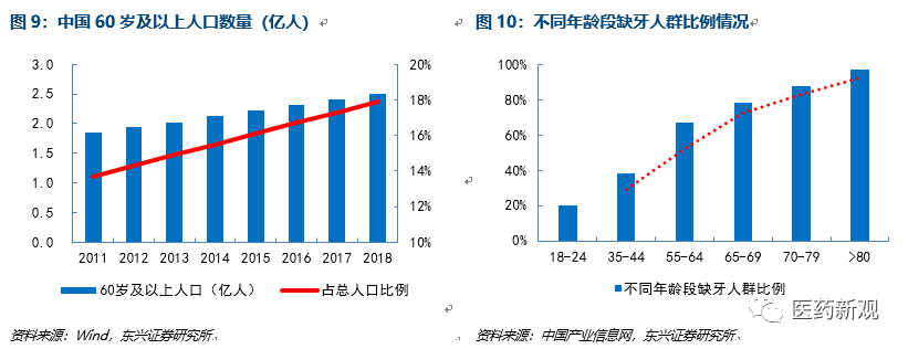 人口老齡化加劇,潛在種牙需求不斷增長。中國60歲及以上的人口在2018年已經(jīng)達到約2.49億人,占總?cè)丝诒壤?7.90%,高齡人口呈現(xiàn)穩(wěn)定增長趨勢。老年人缺牙調(diào)節(jié)率大幅上升。隨著人口年齡增加,缺牙人口比例不斷上升,其中55歲以上缺牙人口比例高于50%以上,人口老齡化的發(fā)展不斷打開種植牙市場空間。