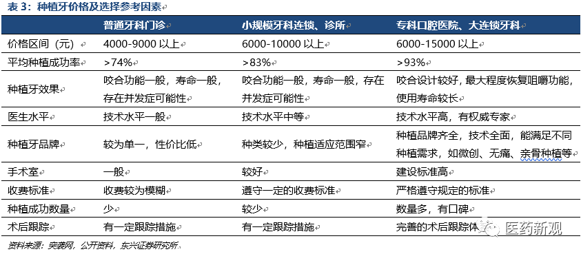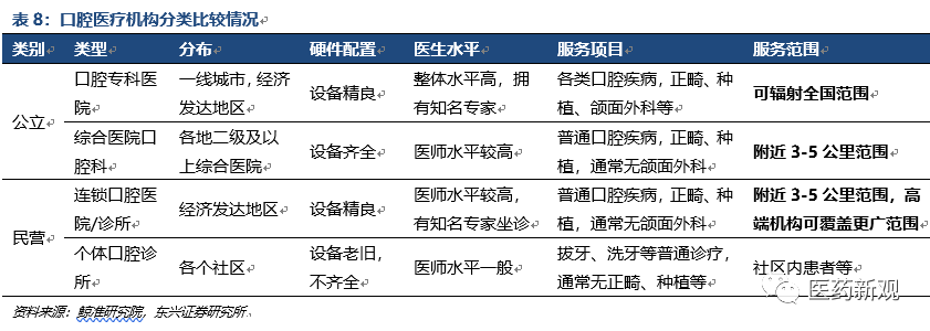 口腔醫(yī)療機構(gòu)服務(wù)遵循就近原則,種植業(yè)務(wù)依托“醫(yī)生+設(shè)備”的高端服務(wù)能力。通過對公立、民營醫(yī)院分類比較來看,除公立口腔專科醫(yī)院的服務(wù)能力輻射全國外,綜合醫(yī)院口腔科、連鎖口腔醫(yī)院(診所)、個體口腔診所均遵循就近服務(wù)原則,服務(wù)覆蓋約5公里范圍。同時,醫(yī)療機構(gòu)需配置高端硬件設(shè)施與高水平的醫(yī)生,才能開展種植、正畸、頜面外科等診療服務(wù)。高端口腔醫(yī)療服務(wù)能力的需求提升,也將促進口腔??漆t(yī)院、綜合服務(wù)能力強的連鎖口腔醫(yī)院(診所)不斷發(fā)展。